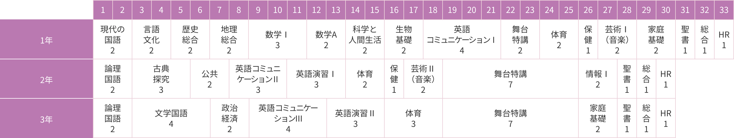 (1年:33 単位、2・3年:30 単位/1週間)